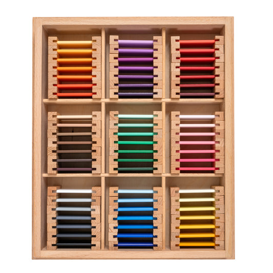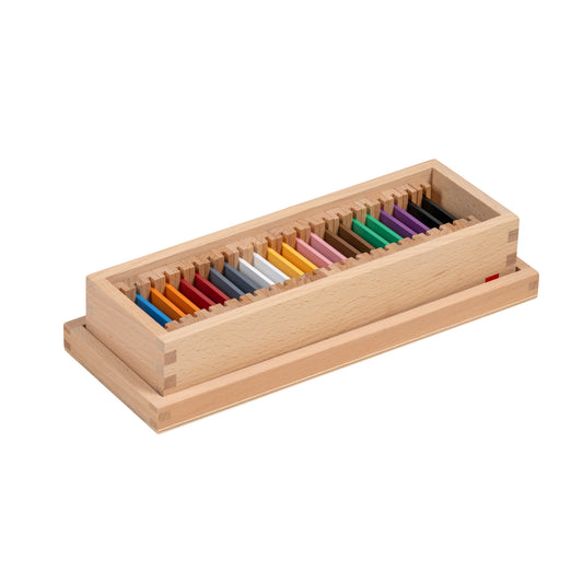 The First Box Of Color Tablets introduces color and refines the chromatic sense. Consists of 6 wooden tablets - a pair each of the primary colors: red, yellow and blue.
