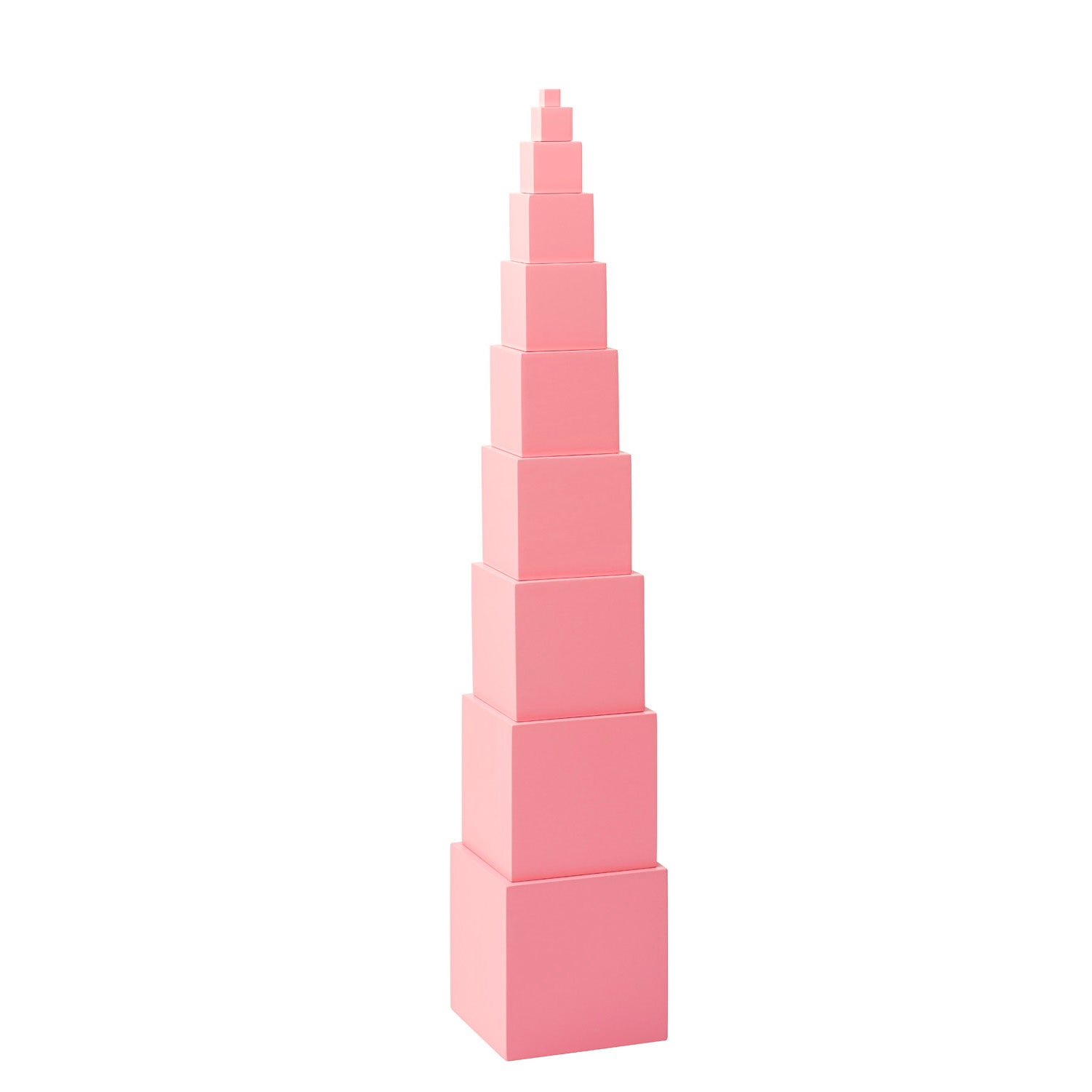 This series of cubes develops visual discrimination of size in three dimensions. Exploration with this material prepares the child for mathematical concepts in the decimal system, geometry and volume. The Pink Tower consists of ten wooden cubes painted pink and graduated in increments from 1 cm3 (small) to 1000 cm3 (large).