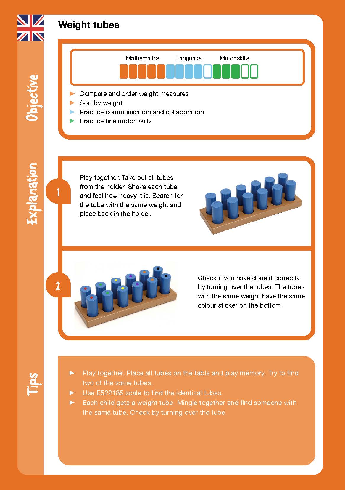 This is a wooden block with two sets of 6 plastic tubes, each six being filled with a variety of weight materials that a child holds to determine their relative weights.