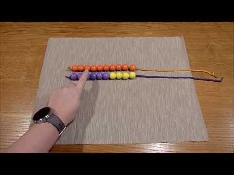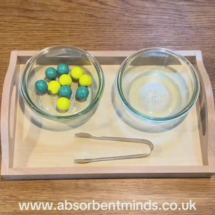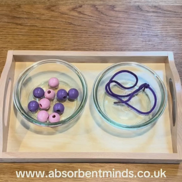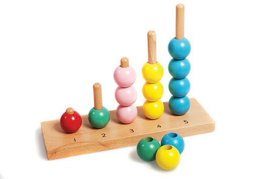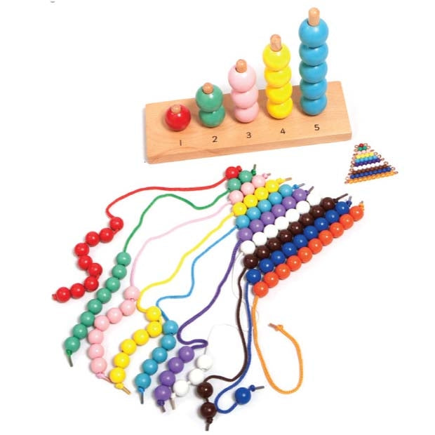 A set of 100 wooden beads with laces in colours to match the short bead stair. Many learning opportunities, including, pincer grip, co-ordination, sorting, patterns. Later these beads can be used for counting, number bonds and calculating (they are especially useful for subtraction).
