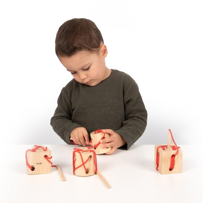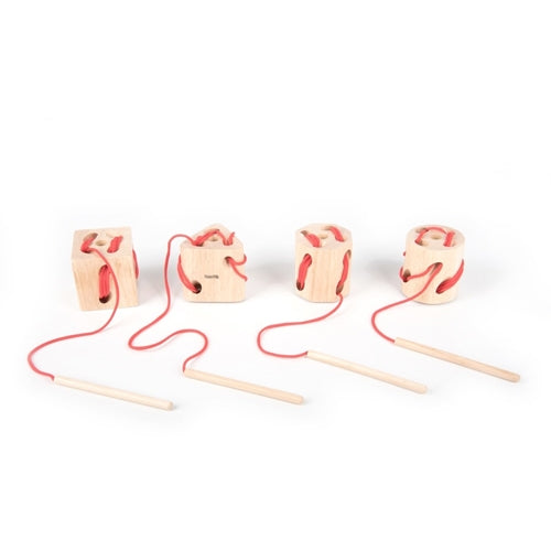 Four wooden blocks with holes and laces with wooden threader, ideal for developing manual dexterity and hand-eye coordination. Includes cylinder, cube, triangular prism and octagonal prism. Excellent for improving motor skills.