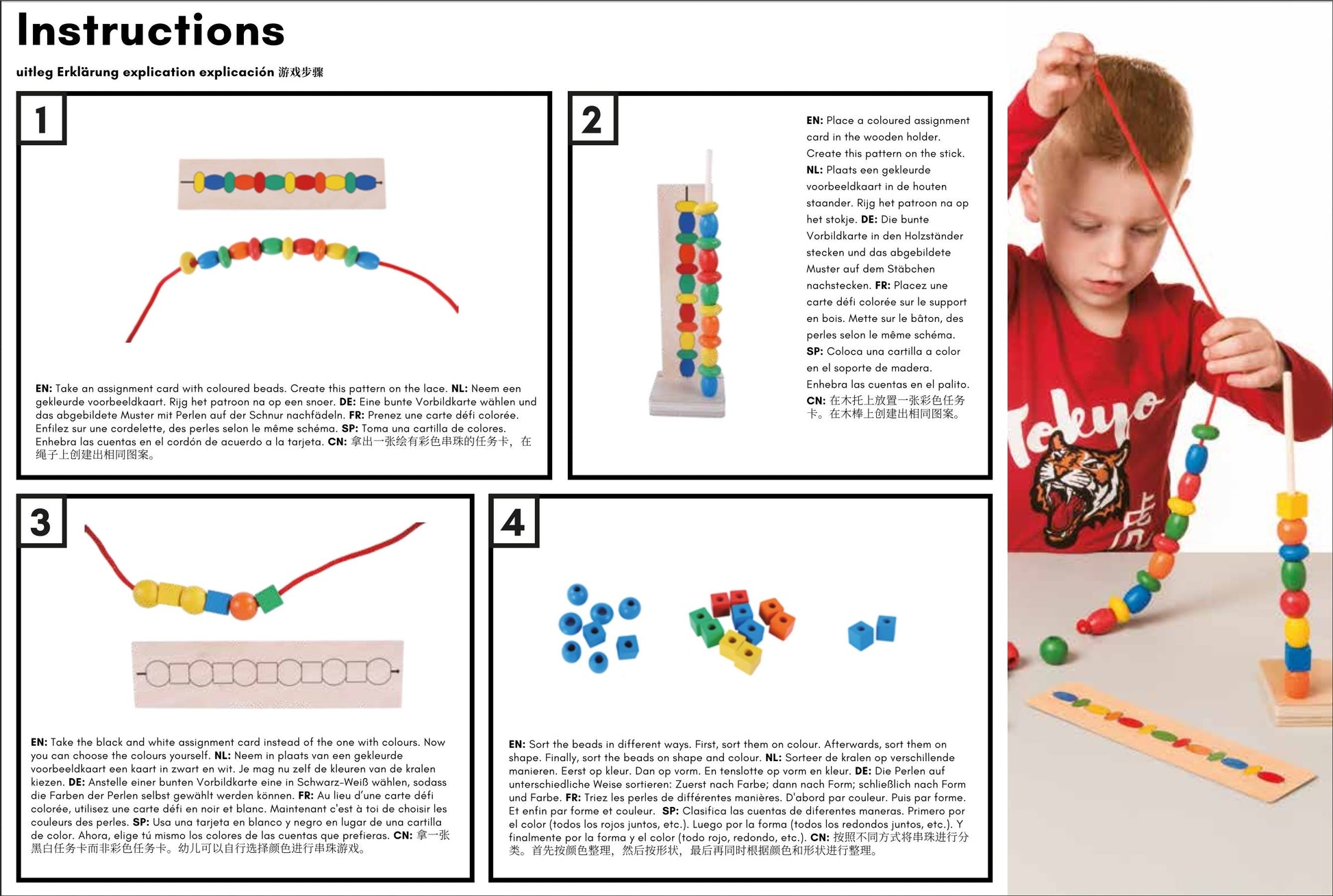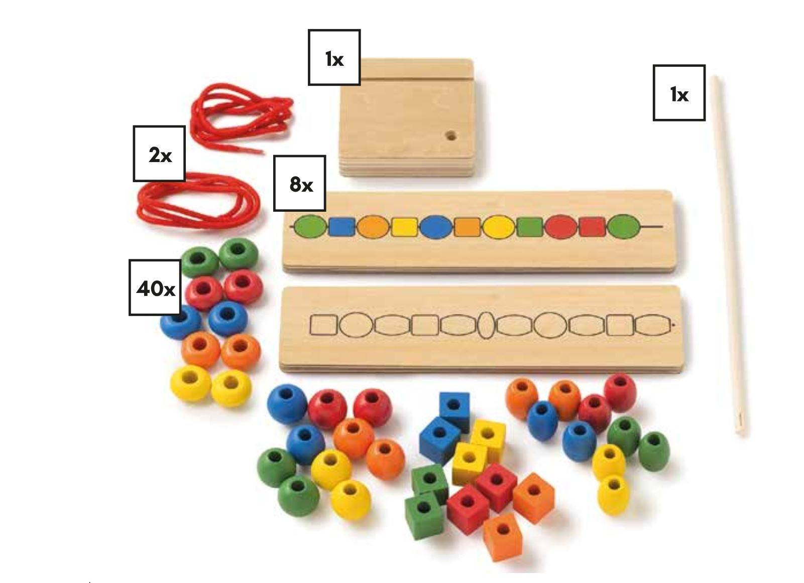 Create beads patterns as shown on the assignment cards by stringing beads on a lace or holder.