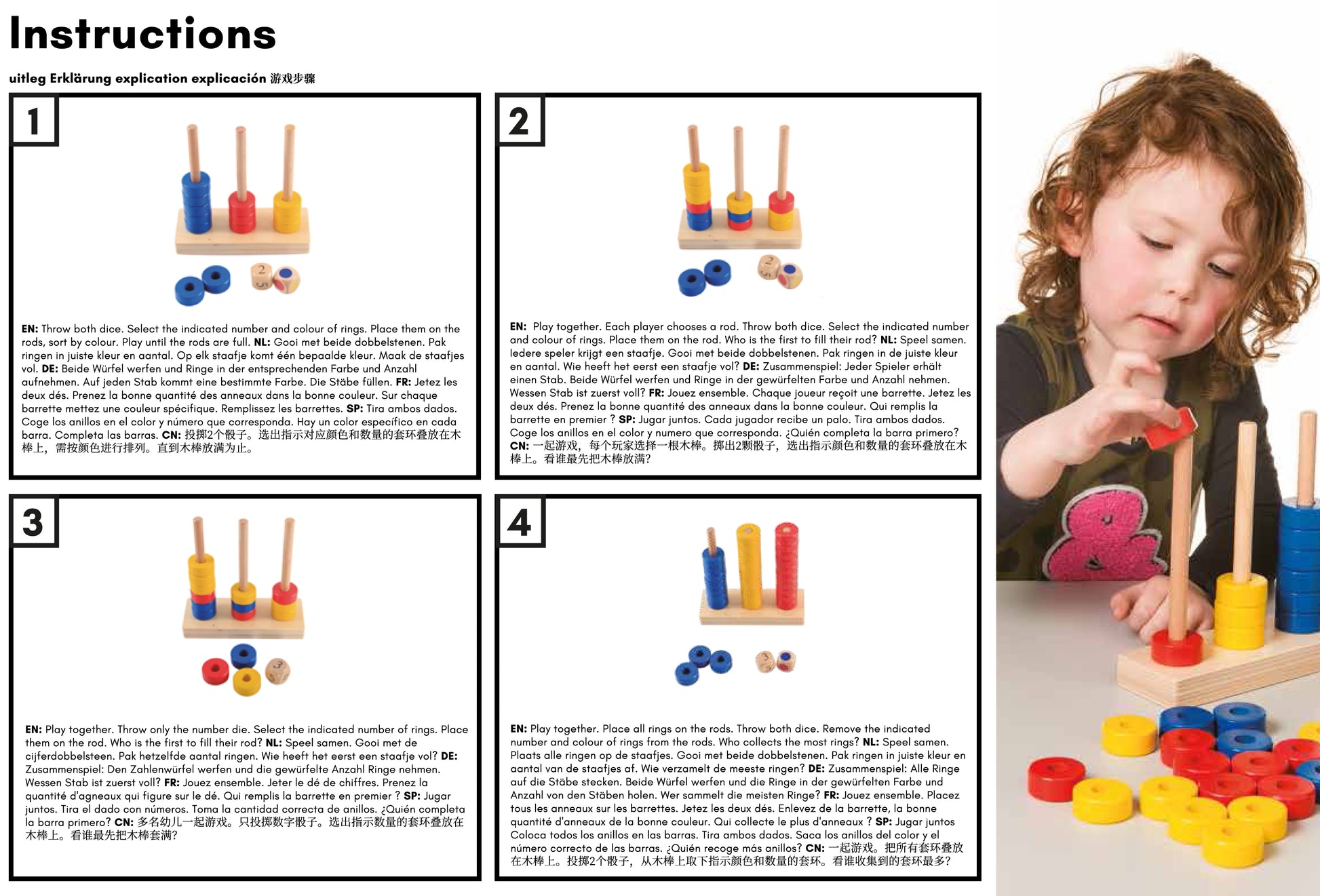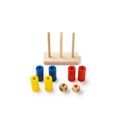 Lancez le dé et collectez les anneaux de la bonne couleur. Qui est le premier à remplir son bâton ? Entraîner le comptage, l'addition et la soustraction.