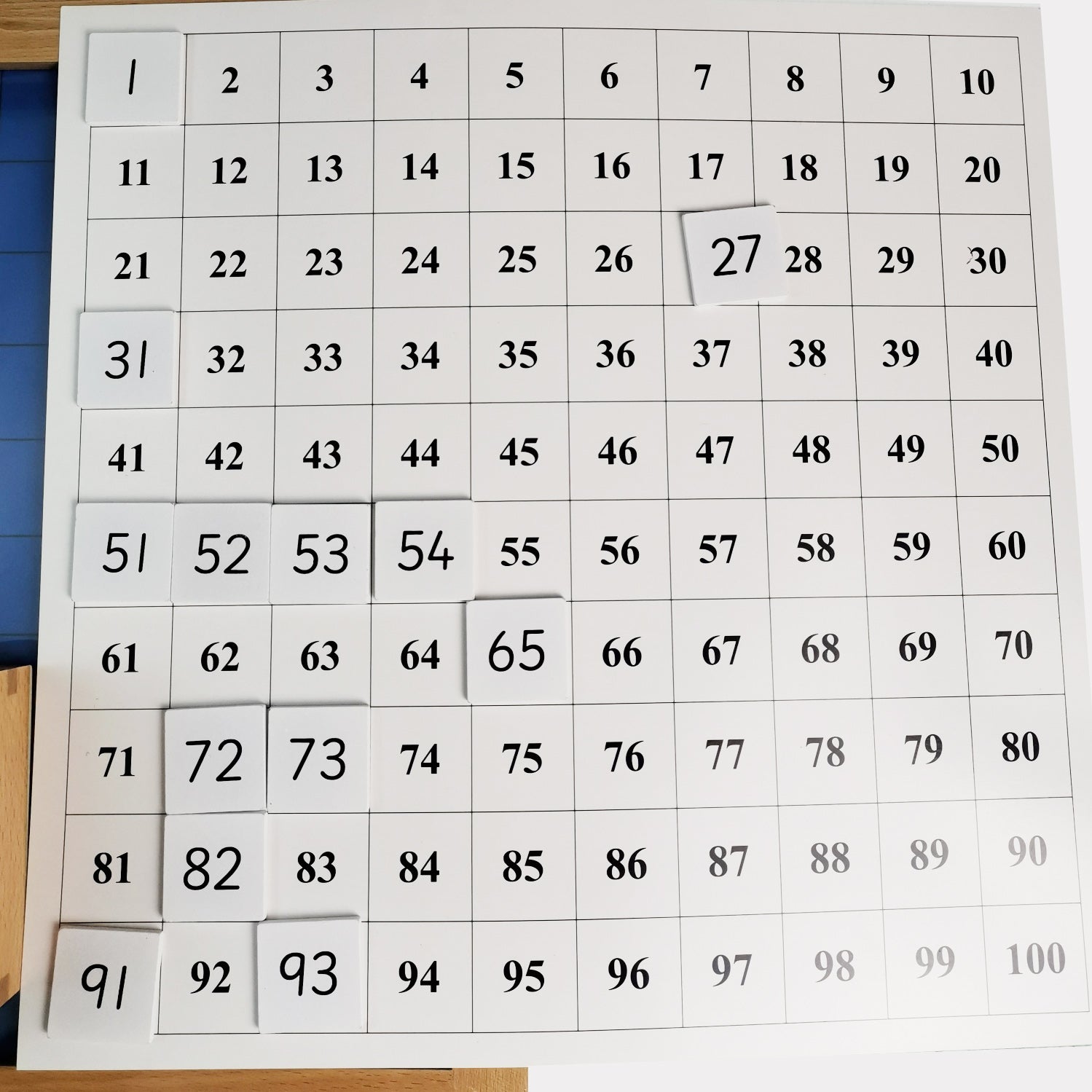 The hundred board allows the child to explore the sequence of numbers from 1-100. The hundred number tiles are placed on the board in sequence from 1 to 100 reinforcing the decimal system and enabling investigation of number patterns.