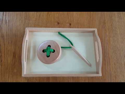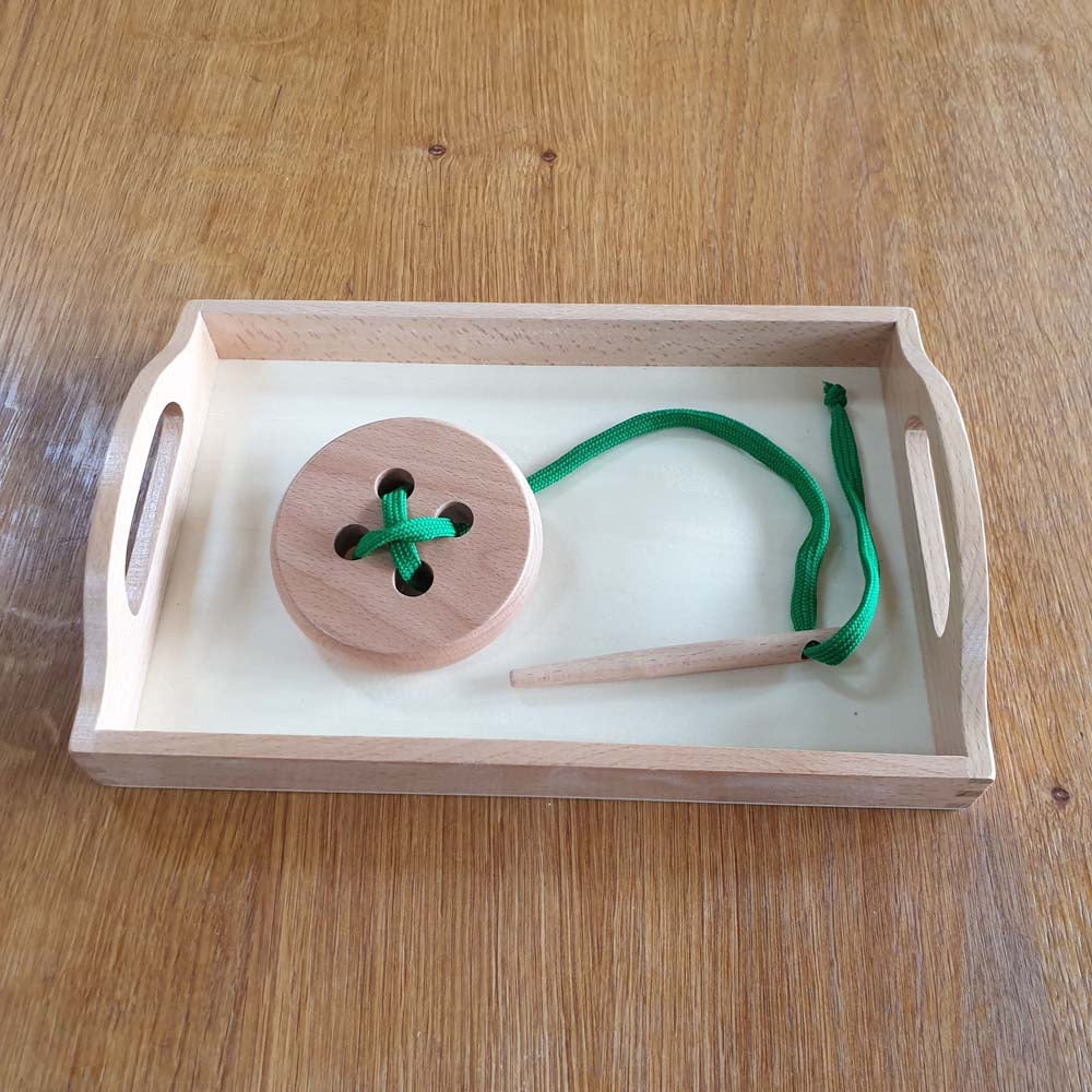 The child can thread the lace through the holes in the button, at the same time s/he develops his fine motor skills, particularly the pincer grip in preparation for writing.