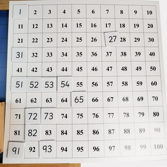 The hundred board allows the child to explore the sequence of numbers from 1-100. The hundred number tiles are placed on the board in sequence from 1 to 100 reinforcing the decimal system and enabling investigation of number patterns.