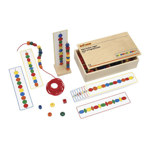 Maxi stringing beads. Learn about shapes, colours, order and patterns with Maxi stringing beads. Children follow the colourful patterns from the card images to fill their stand. Advanced players may begin to make larger patterns using the plastic thread. The assignment cards have an increase in degree of difficulty.