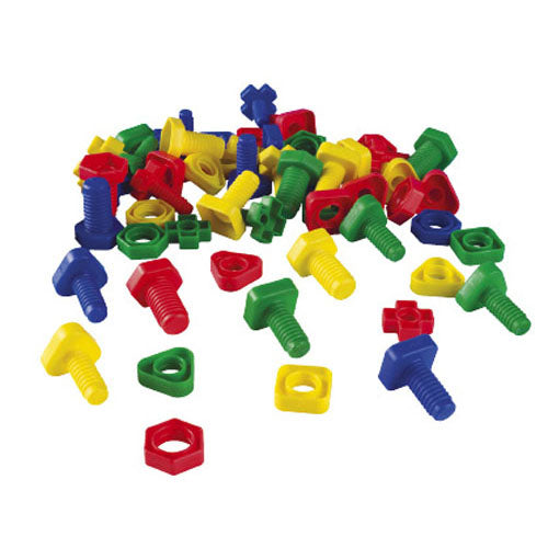 Nuts and bolts. Go nuts! Create all sorts of shape and colour combinations and sequences with nuts and bolts. Develop hand-eye coordination, fine motor skills and colour and shape recognition.