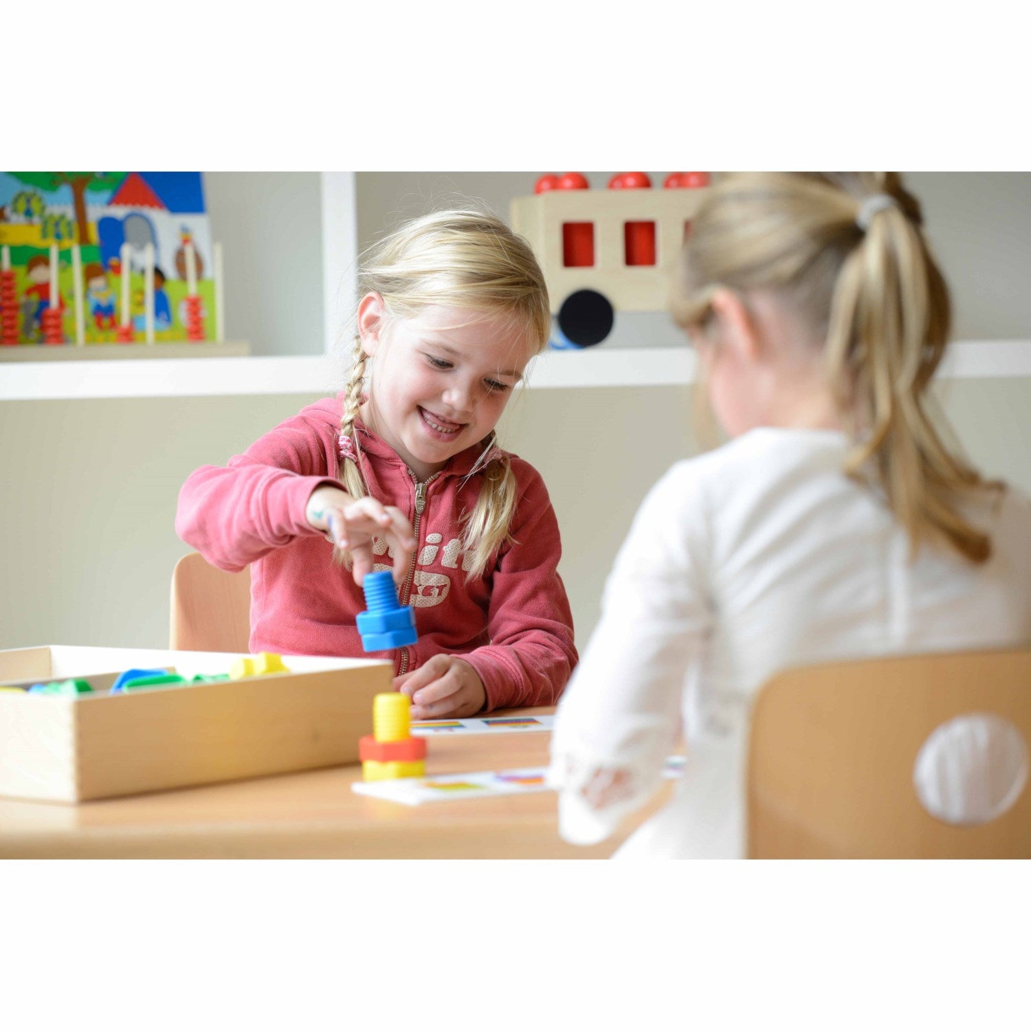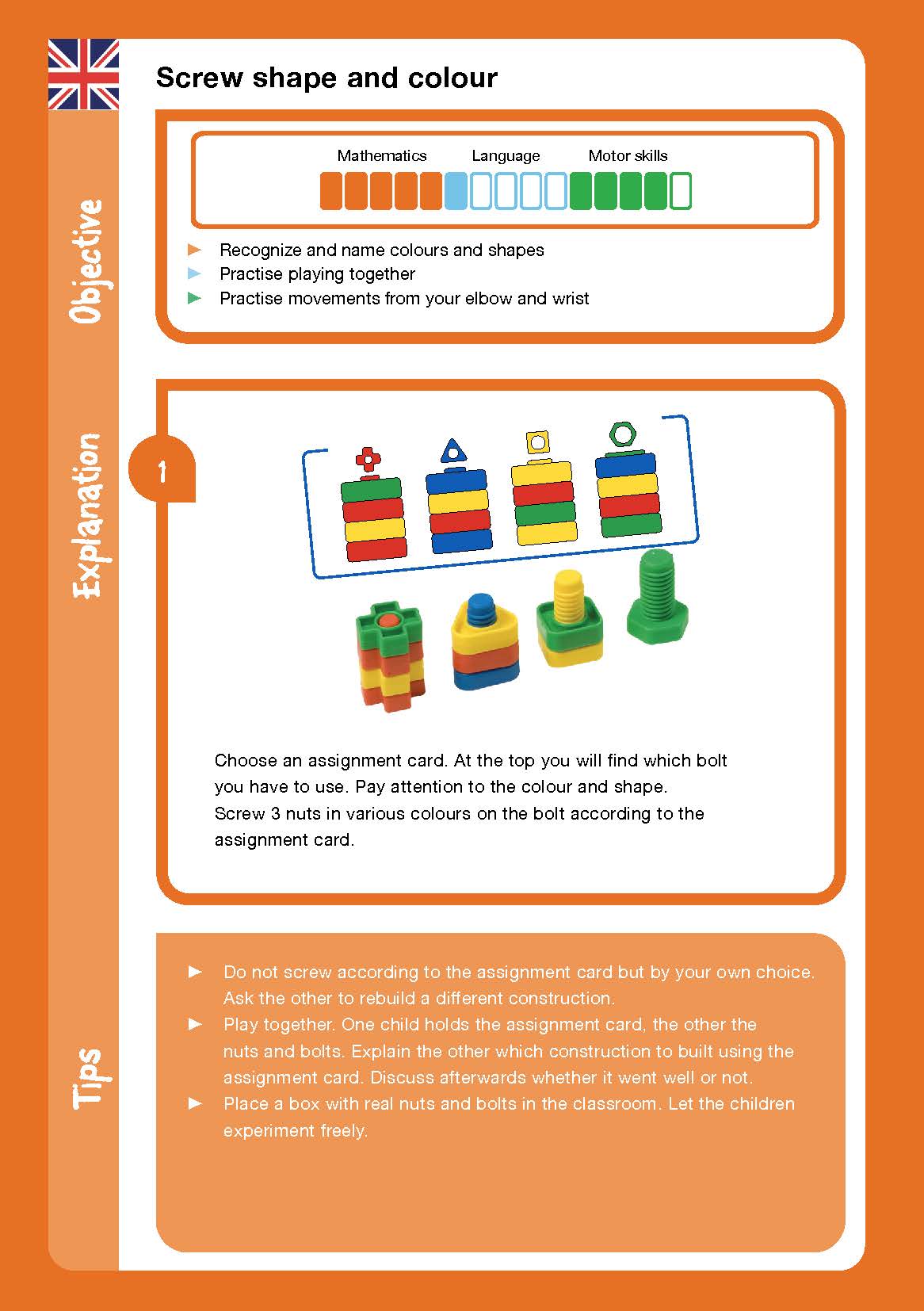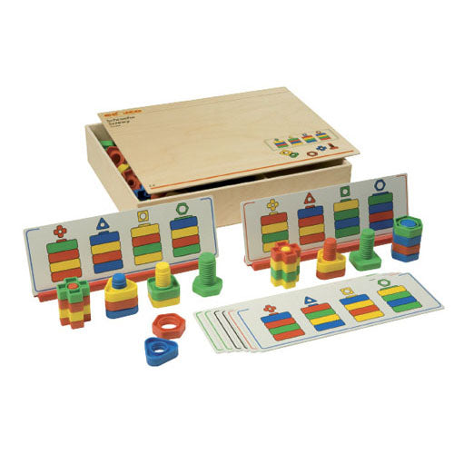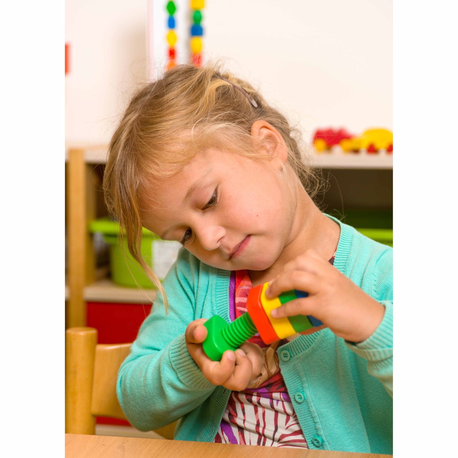 Screwy. This ever-fascinating nuts and bolts game requires children to copy the various colour/shape sequences. Practise recognising and naming shapes and colours and movement with the wrist.