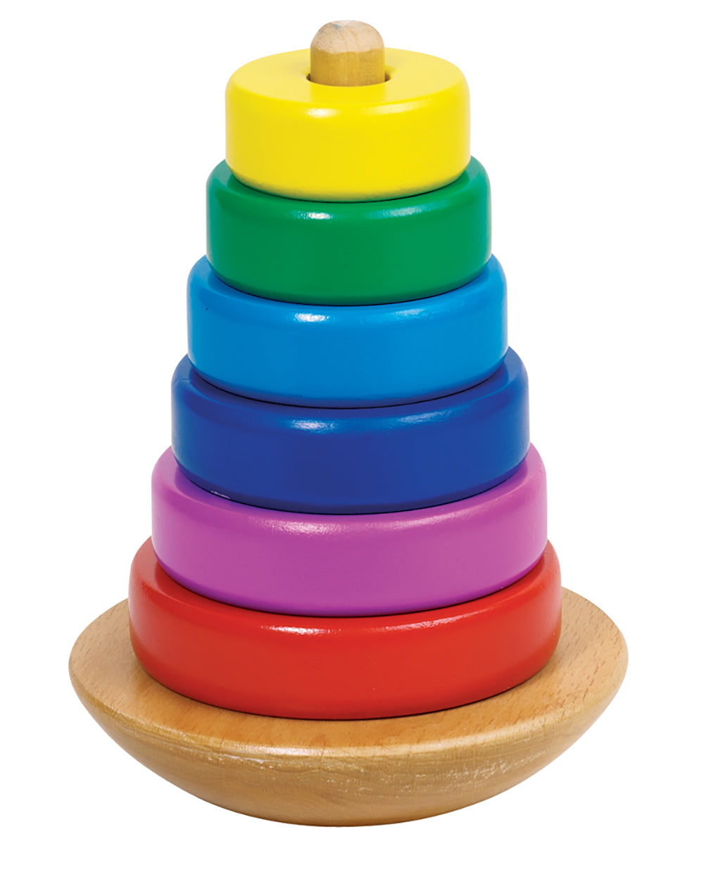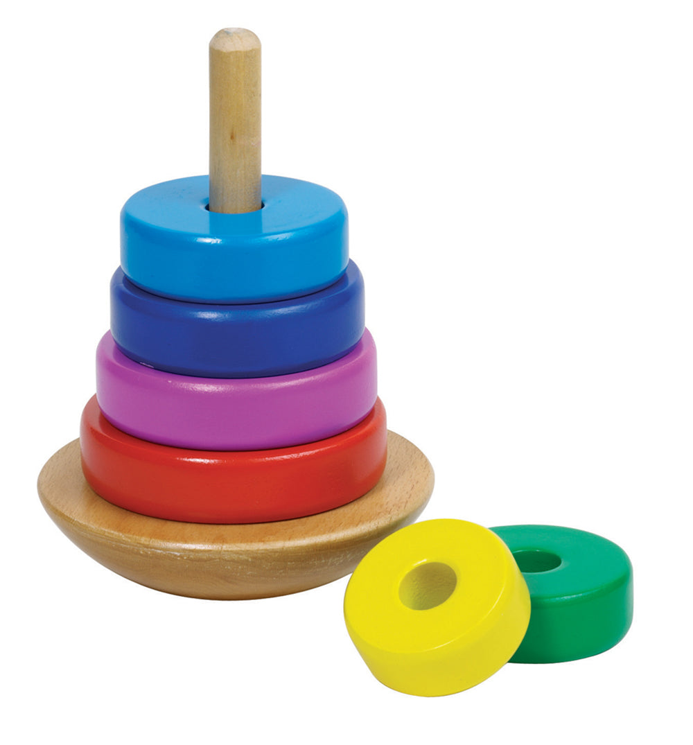 A perennial favourite ring and dowel toy. The base gently rocks towards the child making it easier to reach.