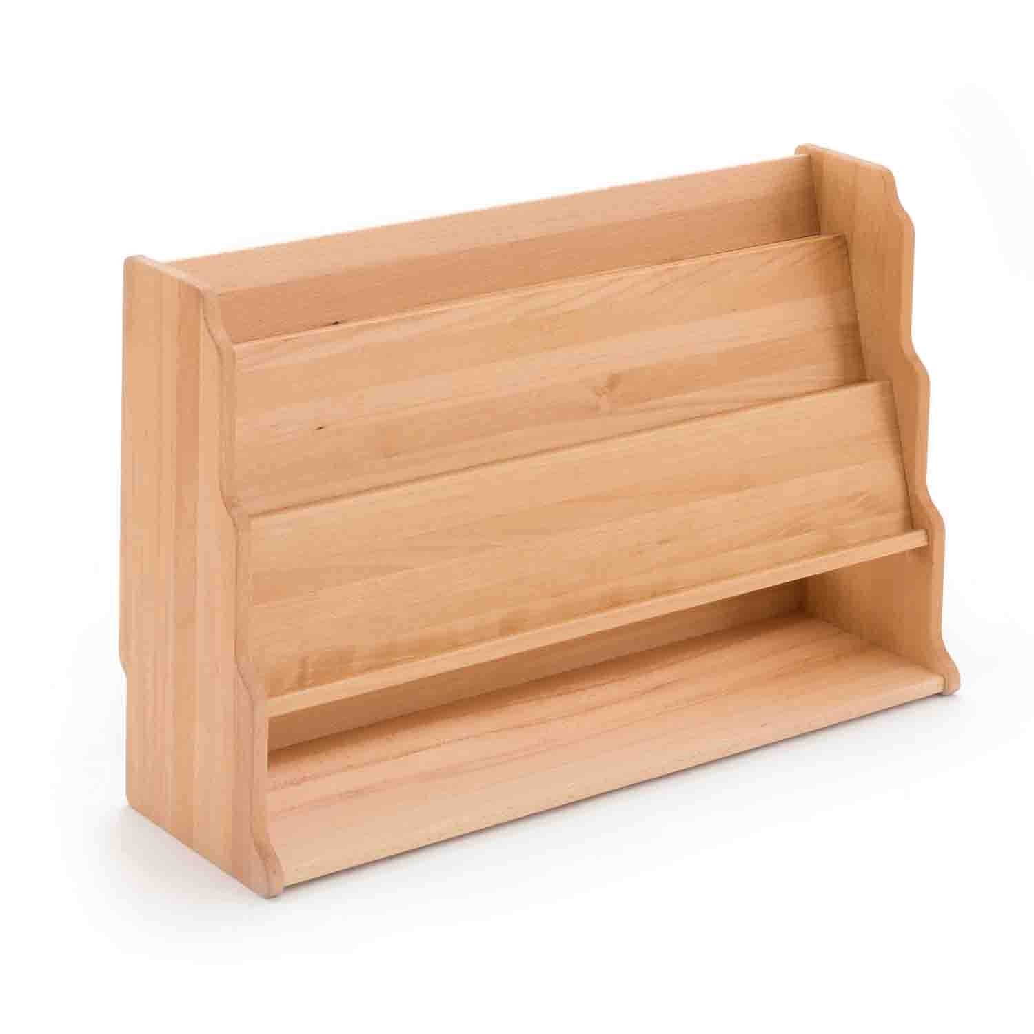 Wooden shelving unit for displaying picture books to encourage book selection.