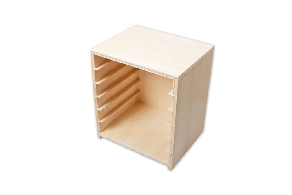 A wooden cabinet for storing six 20cm puzzles and boards, ideal for our birds and flowers puzzles, latch boards and thread & peg boards. By displaying the puzzles they look more attractive and the children are more likely to choose them to work with.