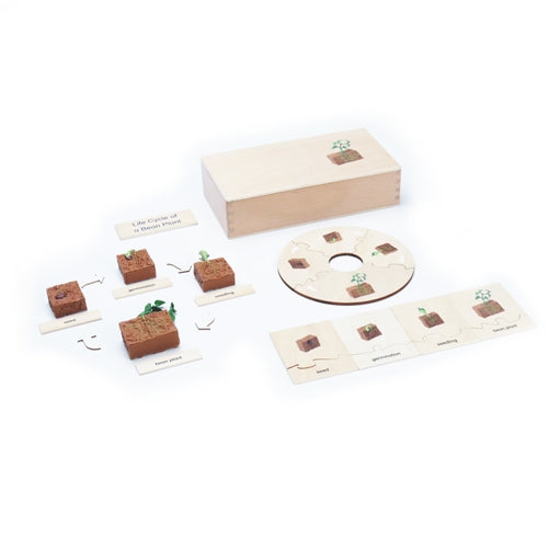The Growthbof a Bean Plant figures accurately show the seed, germination, seedling and bean plant stages of the plant. The wooden cards have a control of error for matching word to picture. Stored in a wooden box with a lid.