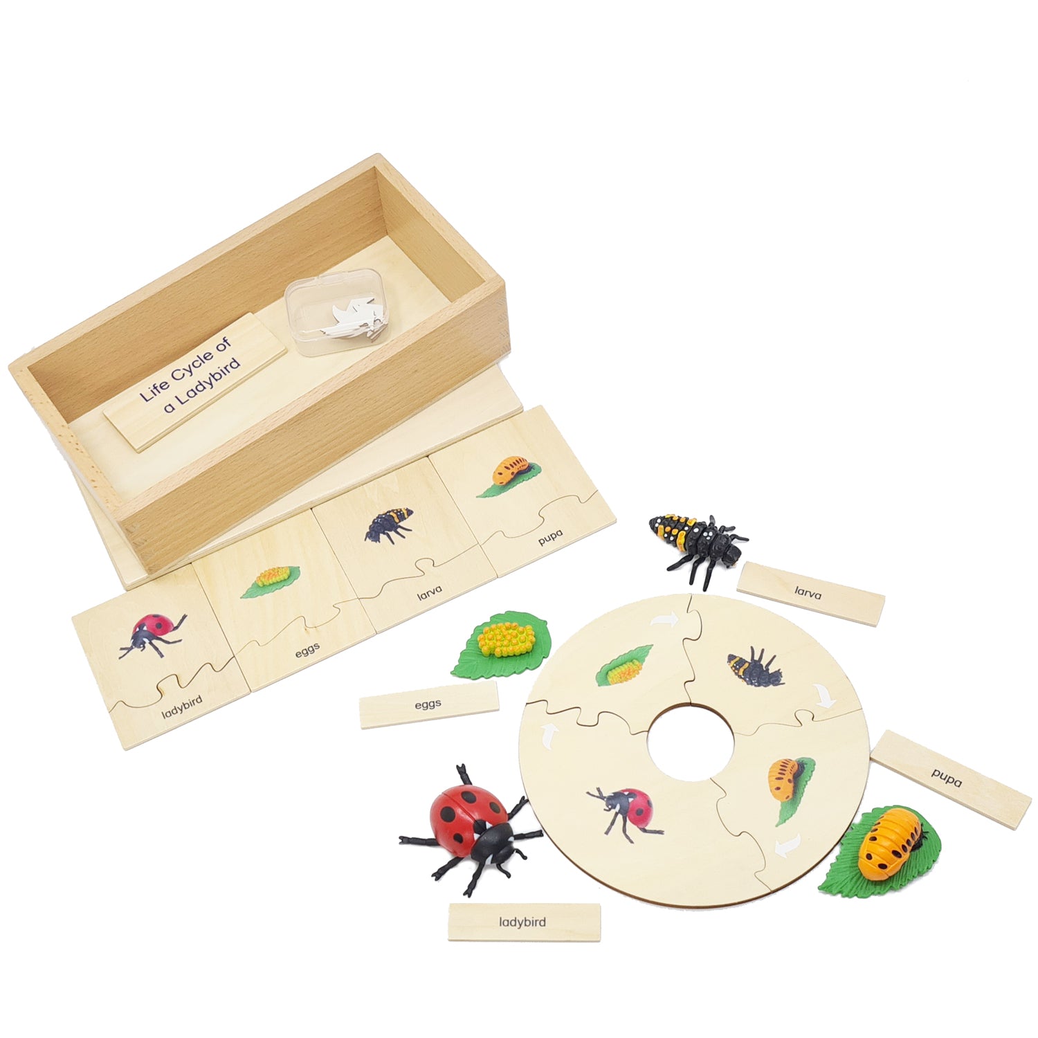 The ladybird lifecycle figures accurately show the Egg, Pupa, Chrysalis and Adult stages of the lifecycle. The replicas are oversized for little hands. The wooden cards have a control of error for matching word to picture. Stored in a wooden box with a lid.