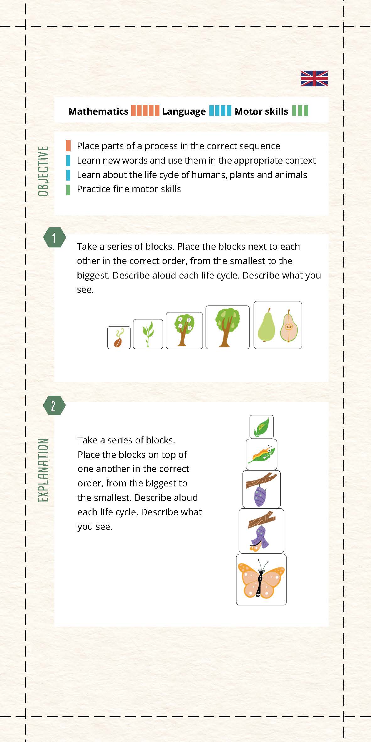 Includes blocks for the life stages of a human, a butterfly, a frog, a bird, a flower, a ladybird, a pear and of rice.
