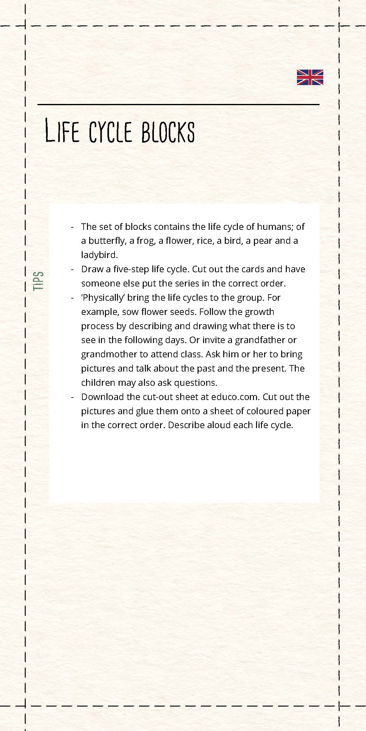 With the ‘Lifecycle blocks’, the children get to know the development of organisms. This stimulates vocabulary and challenges conversations about nature and life cycles.