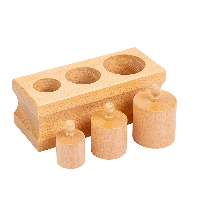 The Cylinder Blocks introduce the child to the first stage of visual discrimination of size. Cylinders progress in height from short to tall with the diameter progressing from thin to thick.