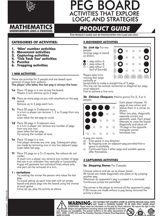 Peg colours are equivalent to the short bead stairs (red, green, pink, yellow, blue, purple, white, black (for brown), navy blue and orange (for gold). 100 of each colour. No peg board included.