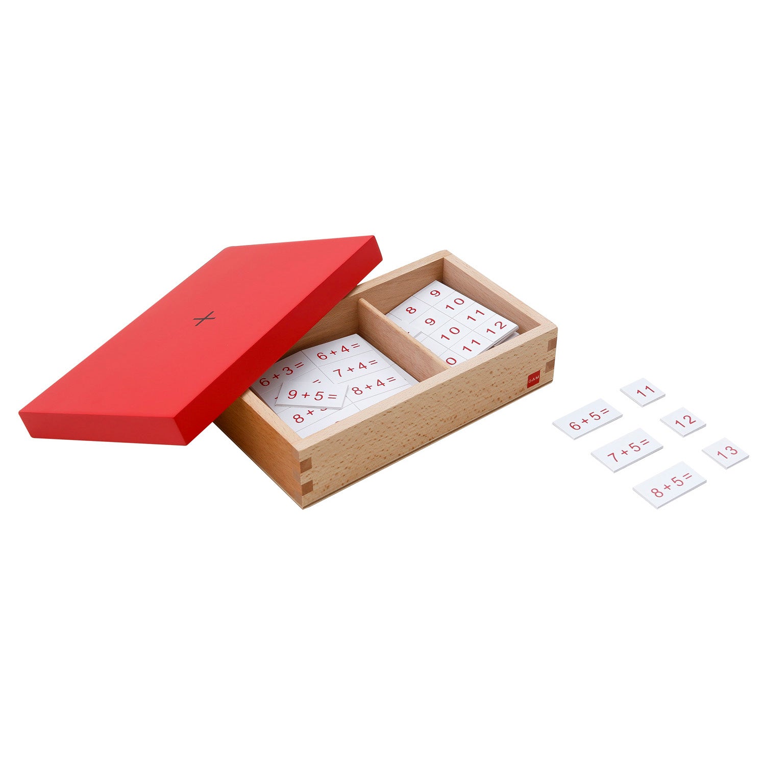 This 2-compartment wooden box with lid contains plastic chips, 1 set with equations printed on them and 1 set with the answers to be used with the Addition Working Charts. All the equations and sums for the addends 1-9 are included.8 are included.