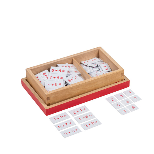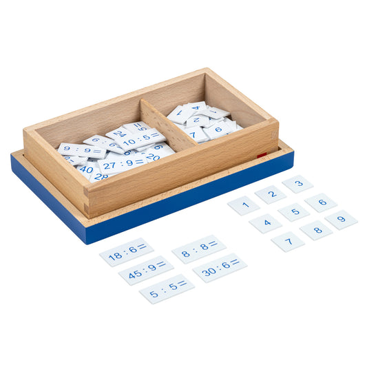 This 2-compartment wooden box with lid contains plastic chips, 1 set of all the equally divisible problems for the numbers 1-81 and 1 set of chips with the answers to be used with the Division Working Charts.