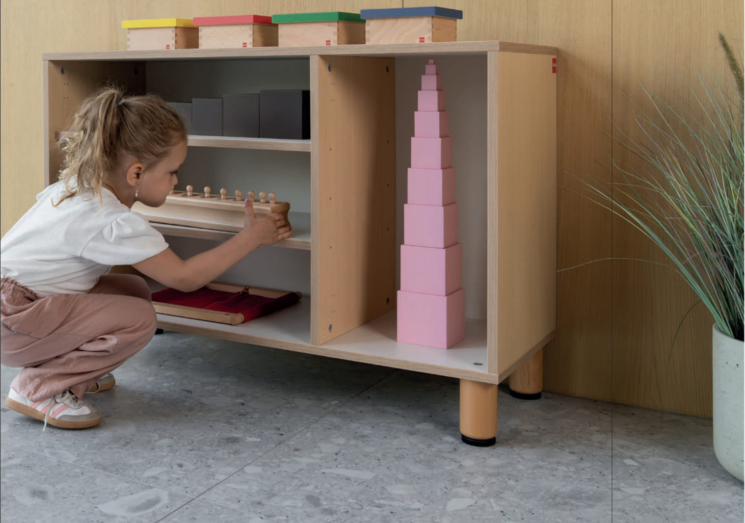 A cabinet designed to hold the pink tower and other sensorial equipment.