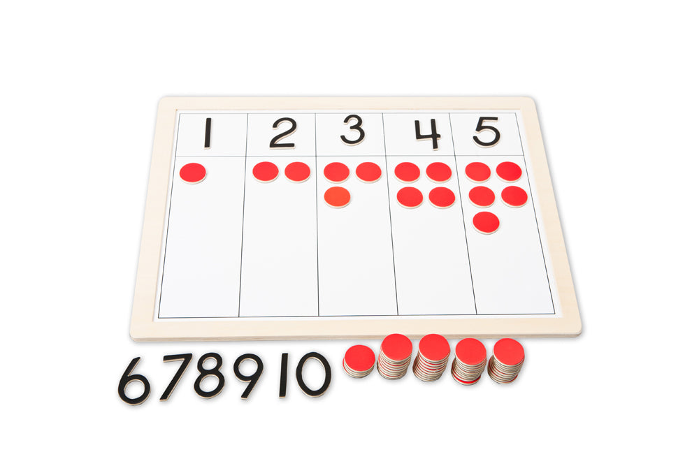 The magnetic wooden numbers 1-10 and 55 red magnetic wooden counters on two marked out boards.