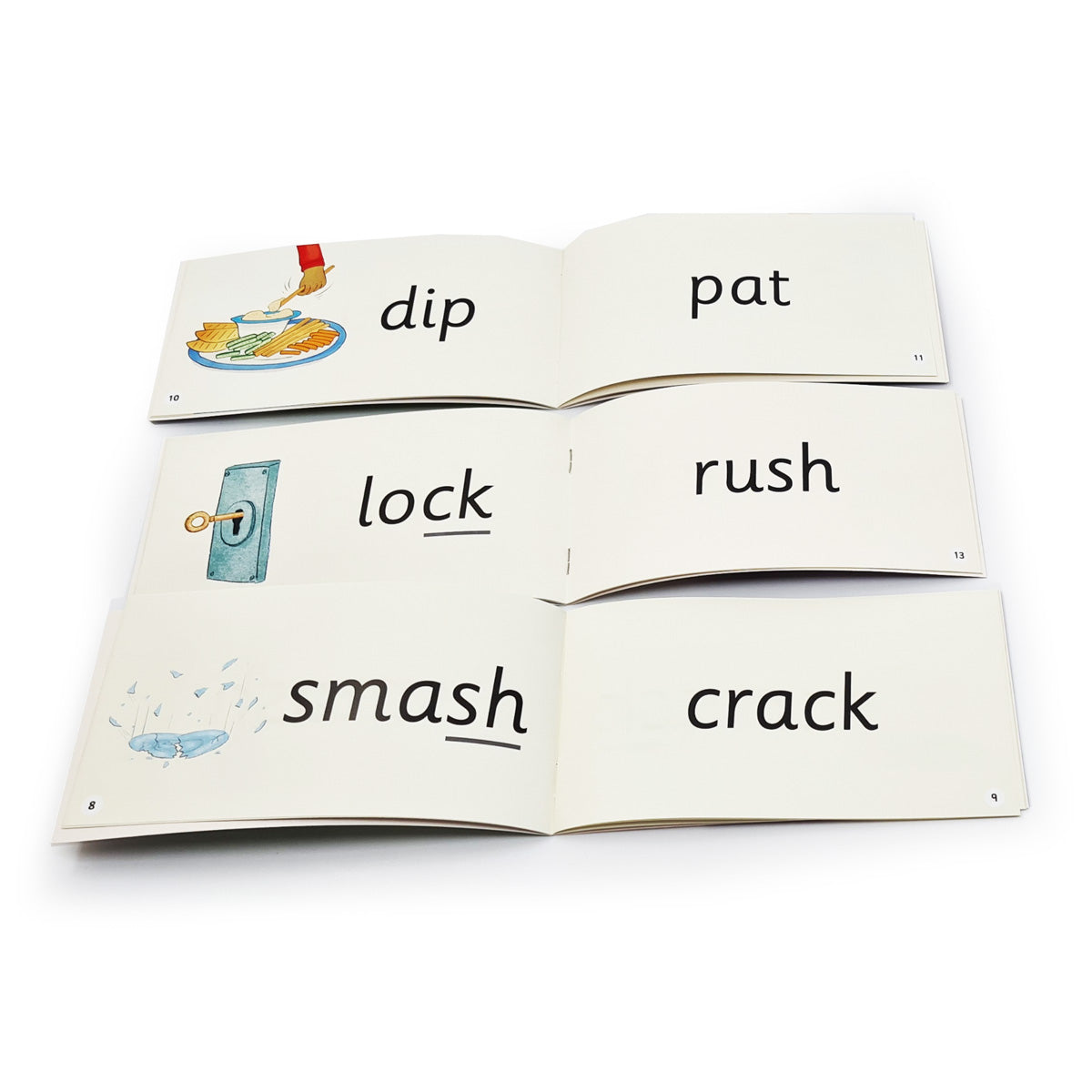 • Control of error: Each word is first encountered on the right-hand page. When the child turns the page, they will see the word again, with any digraphs underlined and an accompanying picture, so they can check they have read the word correctly