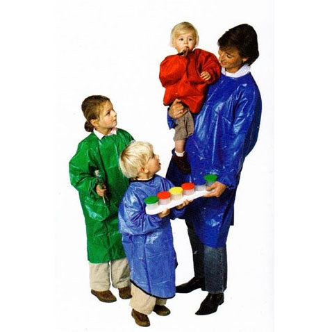 A splash-proof nylon apron. With sleeves with elastic cuffs. Velcro fastening at back.