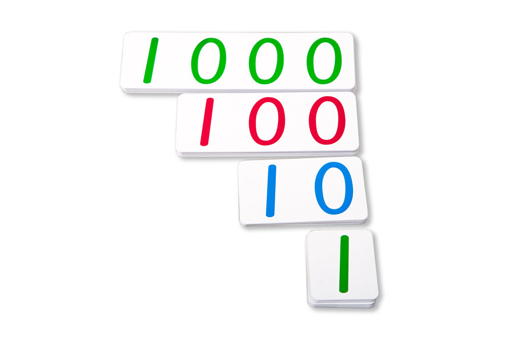 Individual set of plastic place value number cards (1-9999). The number cards differ in length and colour depending on their value and are combined to show the hierarchical nature of the decimal system. They are colour coded to match the stamp game.