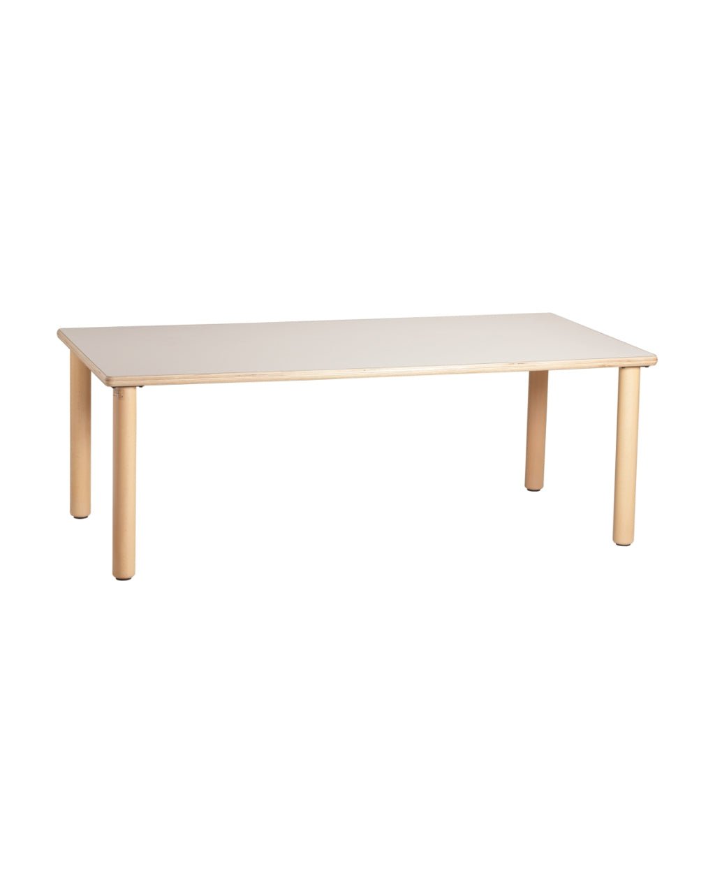 Table with nice blend of of natural wood and a milk white high pressure laminate preventing reflection, wear and tear. The top has a birchwood core, has round corners and smooth edges.