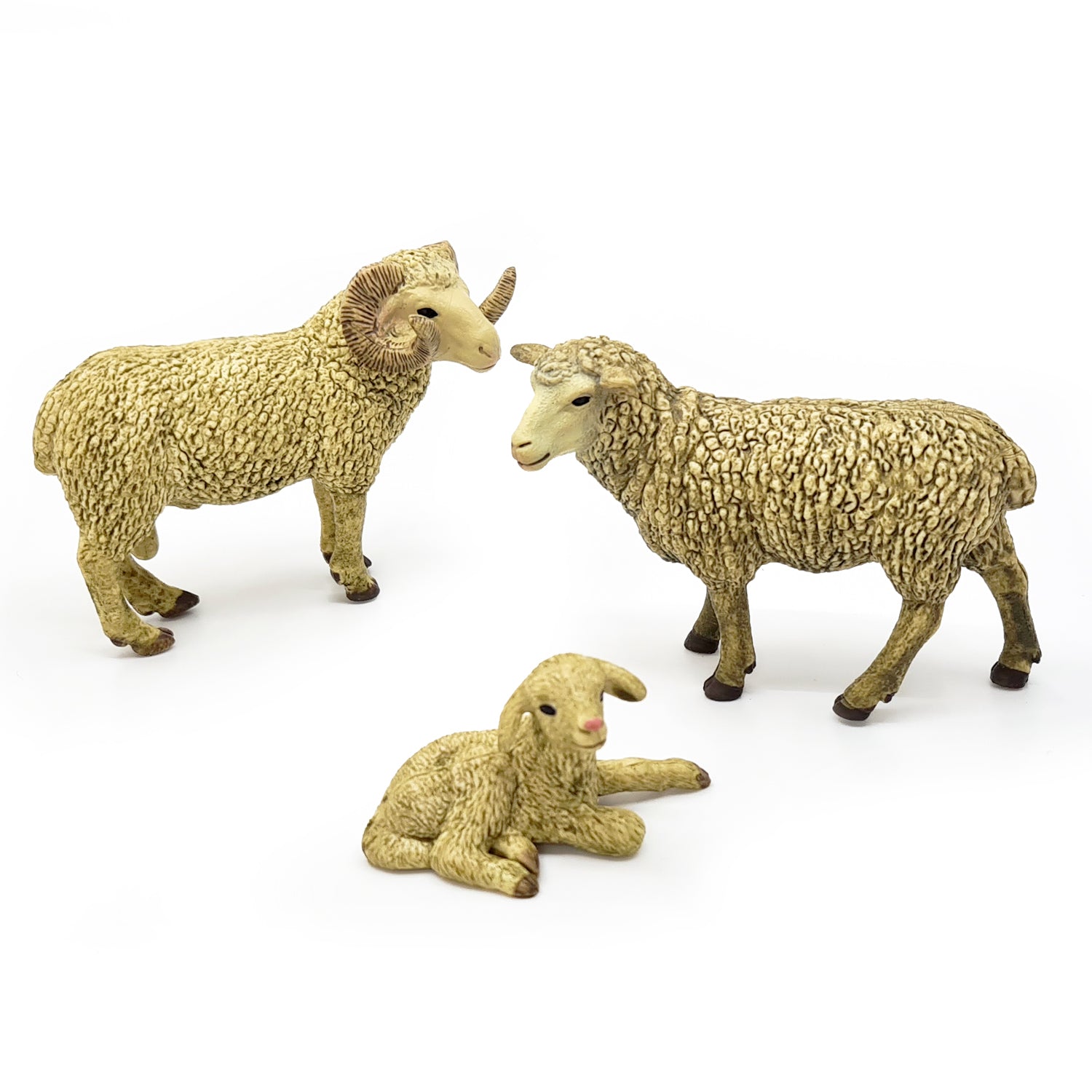 Anatomically correct, animal figures of a sheep family with a ram, ewe and lamb.