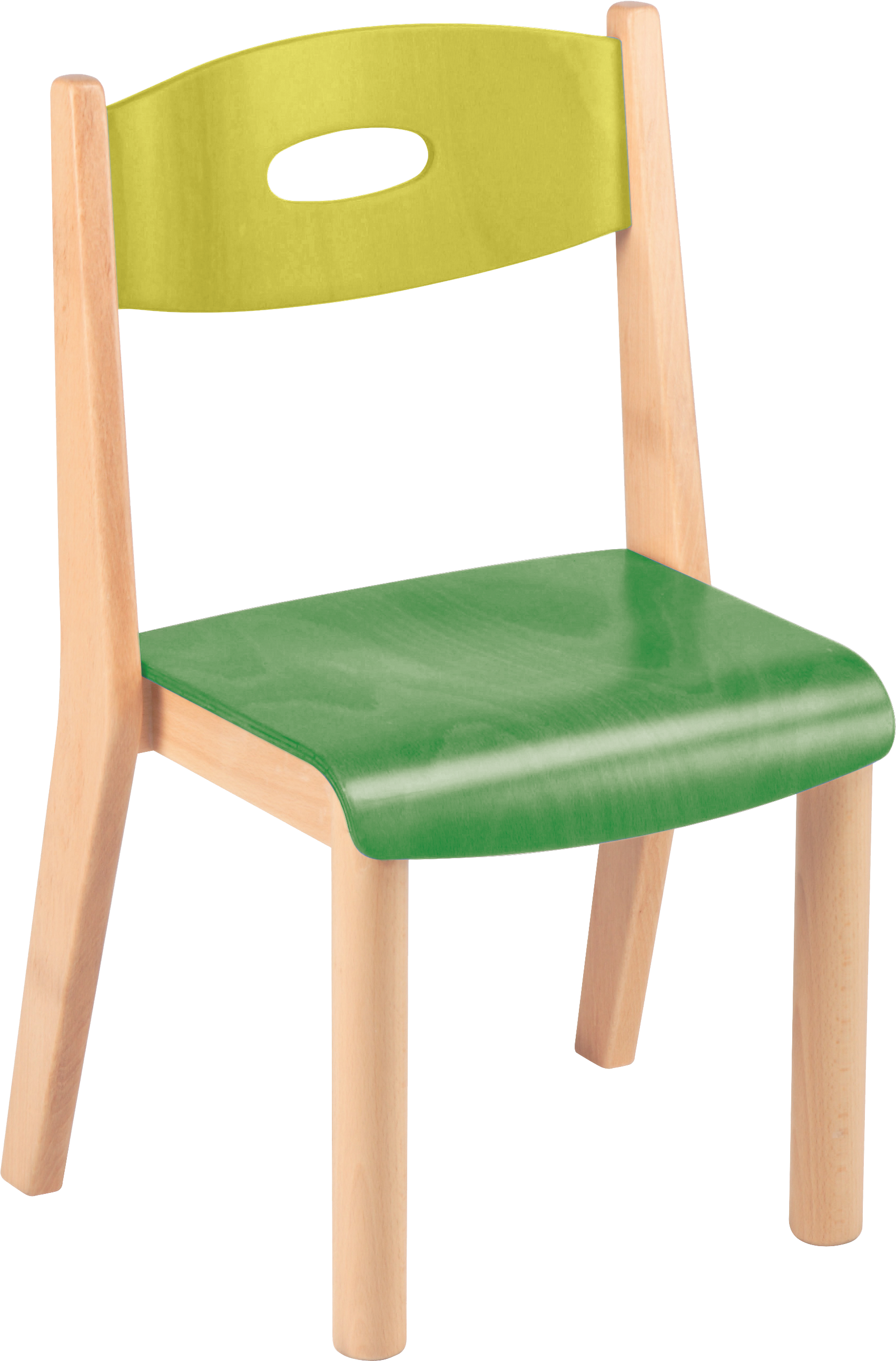 A wooden chair that will stack. Available with blue or green seat and back at 32cm height.
