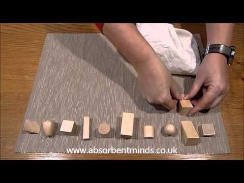 This exercise develops the stereognostic sense of using touch to create a mental image. It is a preparation for work in geometry when the child will study 3-dimensional solids and their properties, but is also an enjoyable game in its own right.