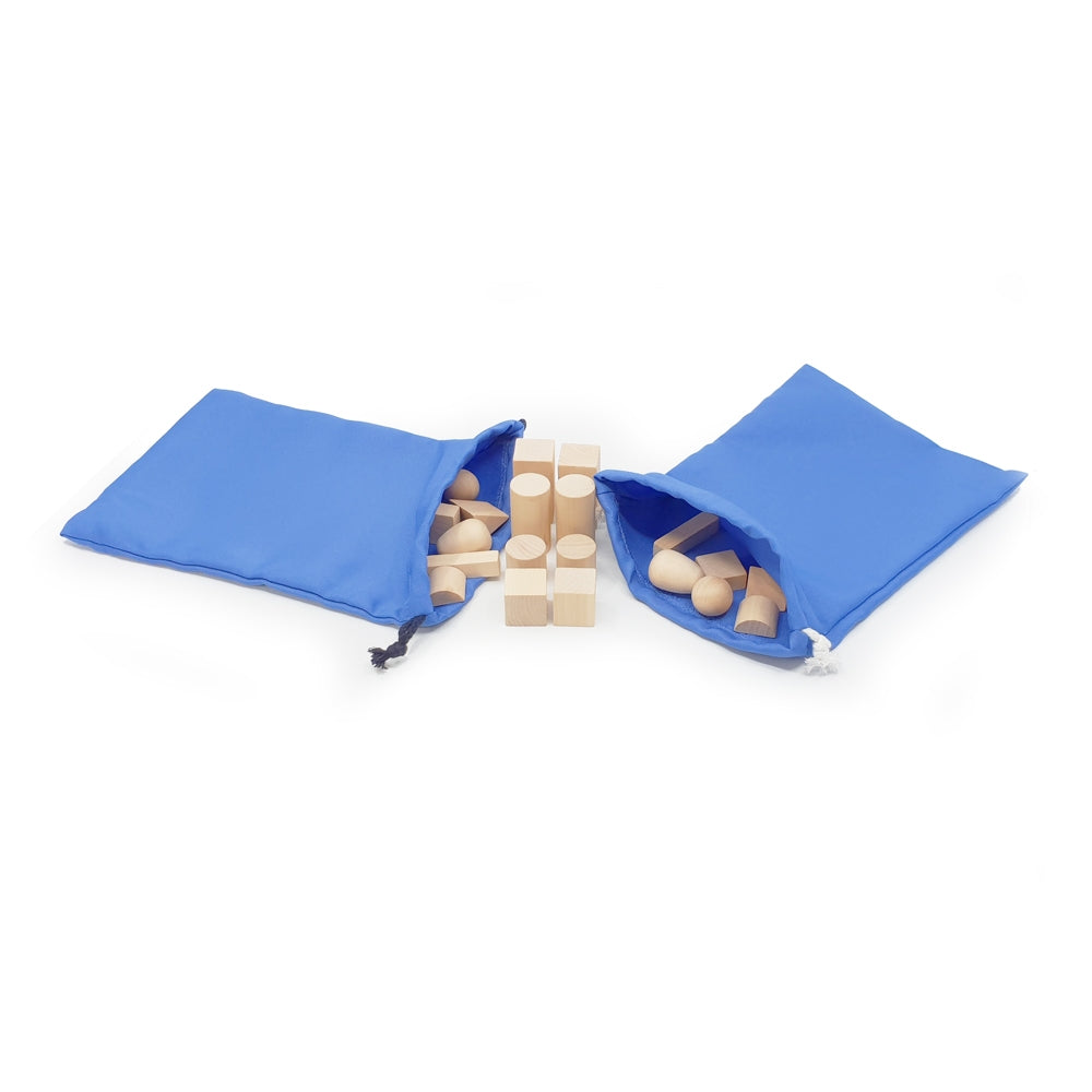 20 natural wooden shapes: 10 matching pairs in two drawstring bags to feel and match.