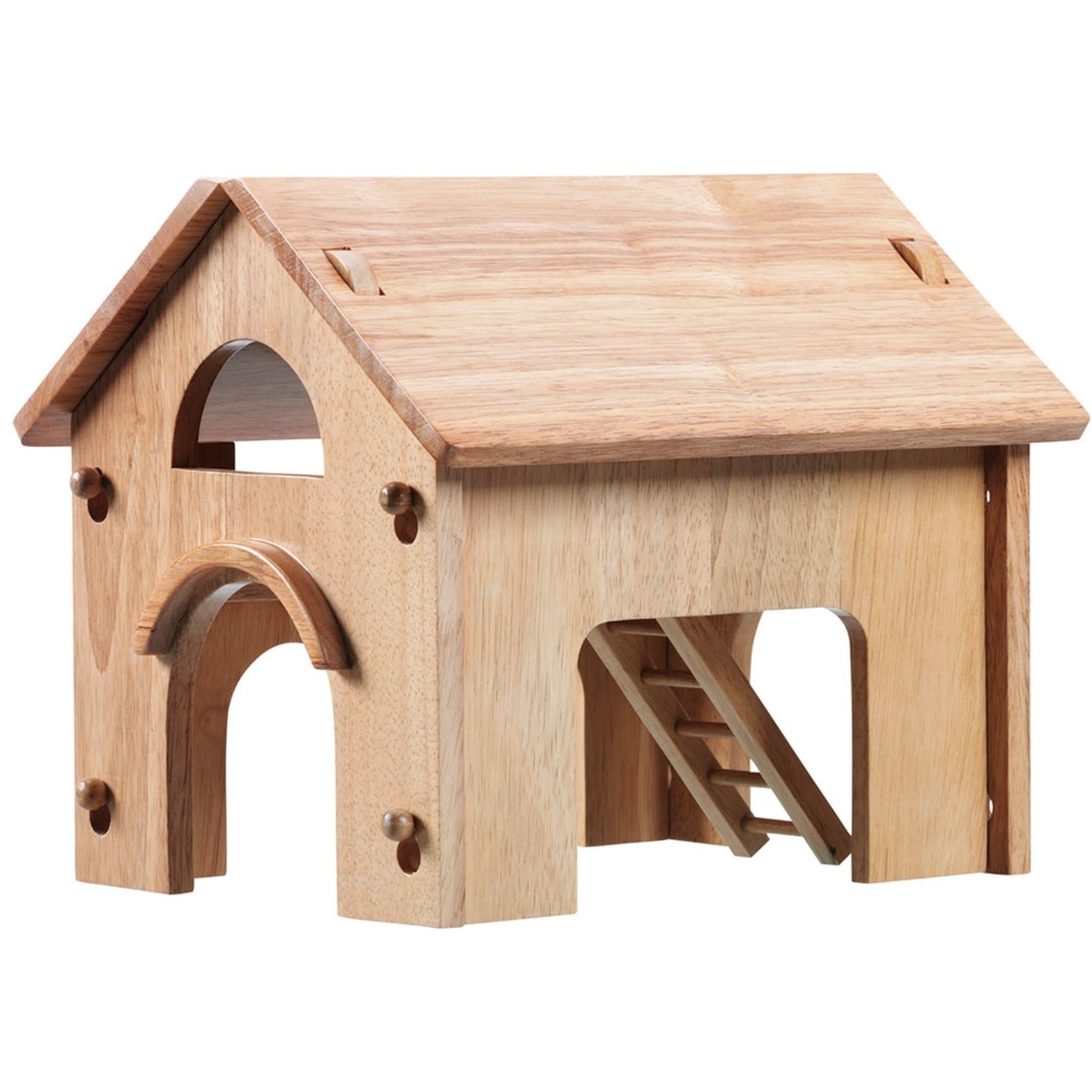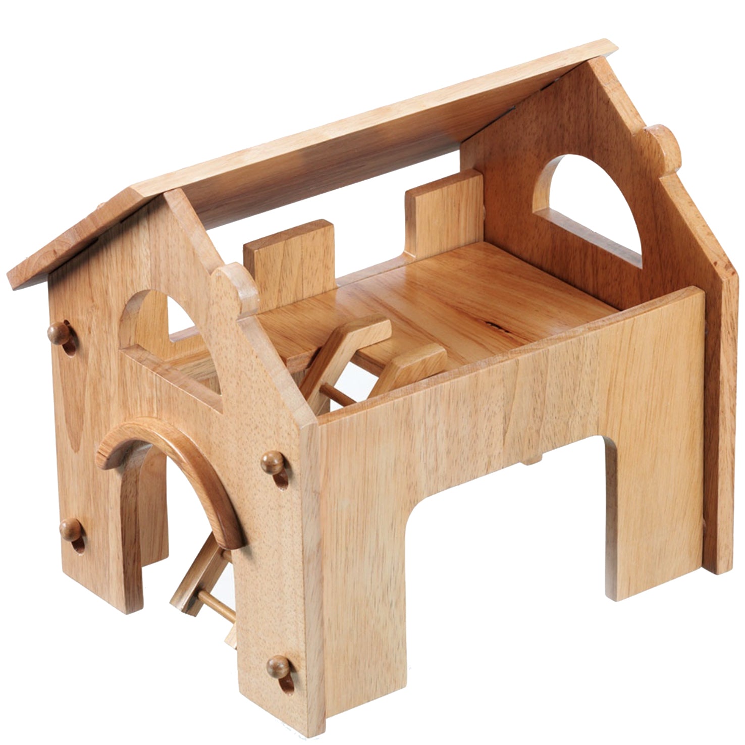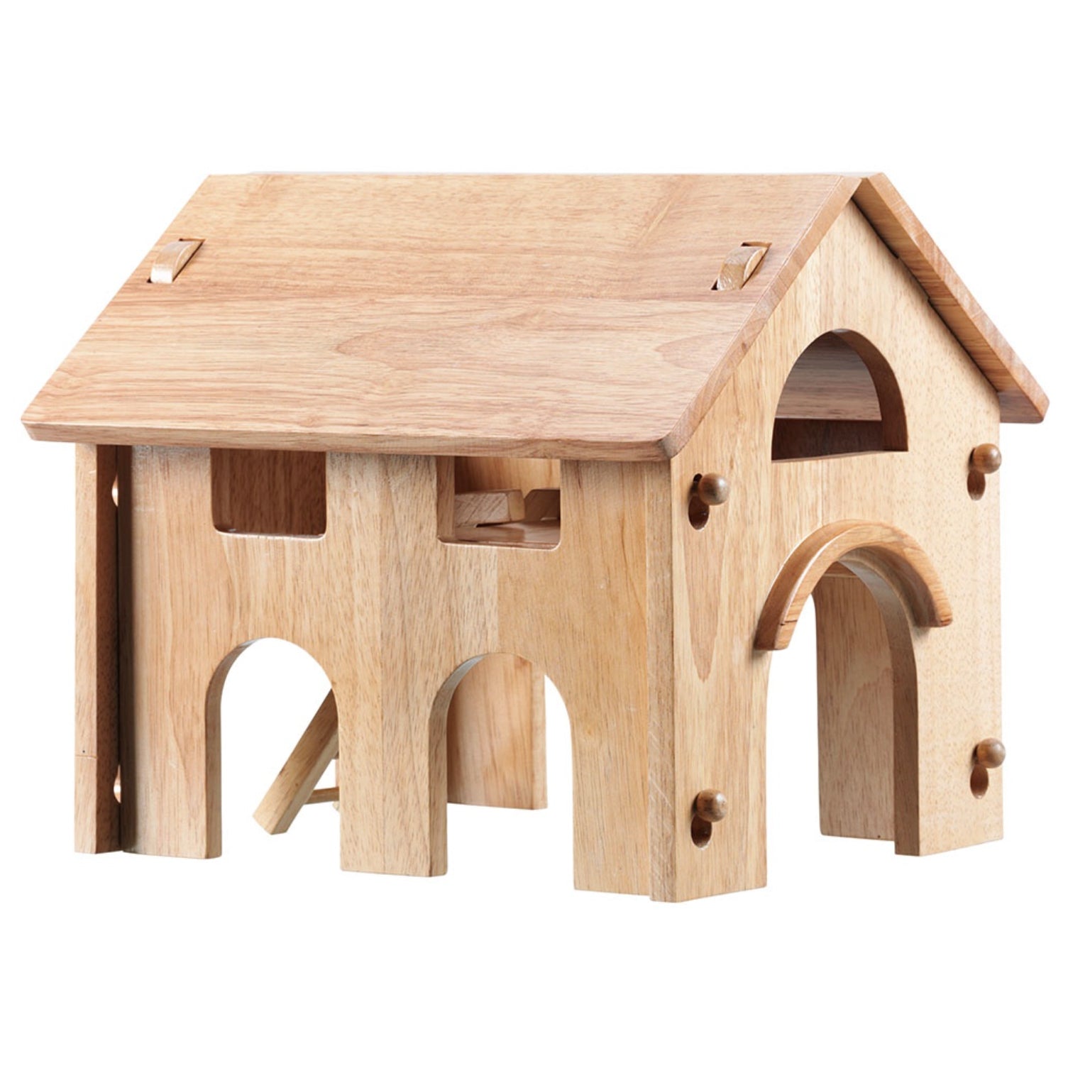 This chunky wooden farm barn is a two-storey farm building with removable roof panels and ladder. With open windows and doors, children can access each side of this wooden toy farm building. It comes with a detachable ladder to reach a high floor and there's plenty of space to house the animals. This beautiful wooden building can be used as a stables, cow shed or hay barn, splitting animals between the ground level and the loft. With imagination it could be other buildings too.
